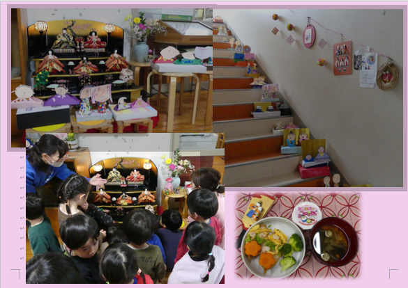 各年齢の段階で雛祭りの雰囲気を楽しみました。雛壇を眺めて会話したり由来や意味に興味をもったり、歌を歌ったり布等でおしゃれに着飾ったり、あられを食べたり…。園内の様々な場所には子供達によって飾られた手作り雛人形が並んでいて、雛巡りもできますよ