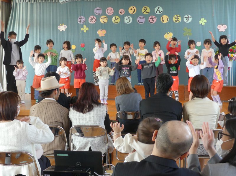 0歳児から5歳児までのかわいくて元気なお友達が仲間入りです。ひまわり組さんは、年長になって初めての全体の場での出番!緊張や気持ちの昂りから、園歌はすご~く速くなっちゃったけど、大きな声で紹介したり手遊び👐で楽しませてくれました。